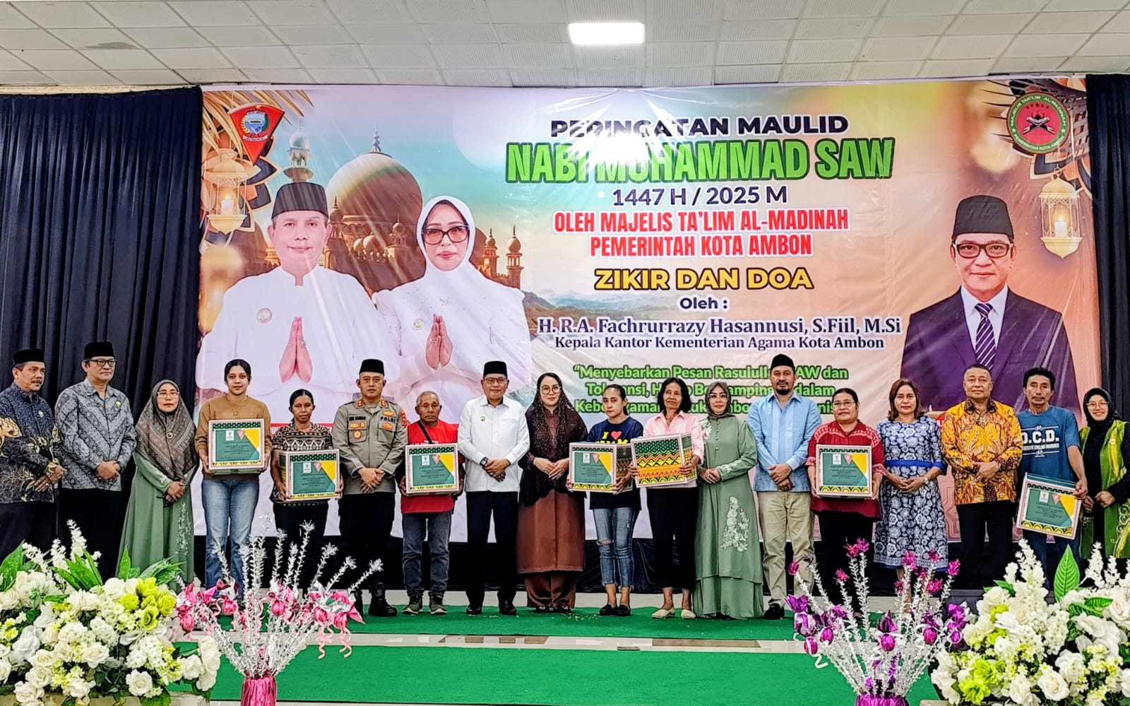 SM.COM, Ambon, 2 Oktober 2025 – Ribuan jamaah dari berbagai kalangan memadati Islamic Center Ambon dalam peringatan Maulid Nabi Muhammad SAW 1447 H/2025 M yang diselenggarakan oleh Majelis Ta’lim Al-Madinah Pemerintah Kota Ambon, Rabu (2/10). Acara berlangsung khidmat dengan lantunan zikir dan doa bersama yang dipimpin langsung oleh Kepala Kantor Kementerian Agama Kota Ambon, H. R. A. Fachrurrazy Hasannusi, F.Fil, M.Si.